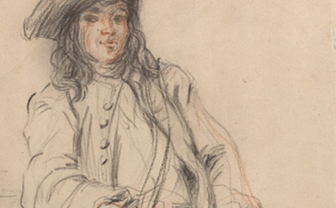 Eric Hebborn (1934-1996), Standing Young Man Leaning on a Plinth, in the style of Jean-Antoine Watteau (French, 1684 -1721), 1970s, black and red chalk on laid paper. Courtesy of the National Gallery of Art, Washington, DC. Gift of Dian Woodner, 2008.38.6.
