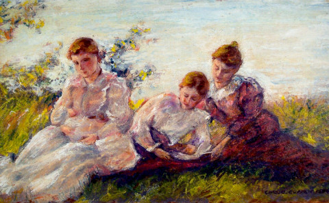 Mark Landis (b. 1955), Women Seated on Lawn, in the style of Charles Courtney Curran (American, 1861-1942), ca. 2000, oil on pressed board. Courtesy of the Paul and Lulu Hilliard University Art Museum.