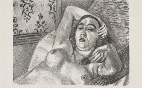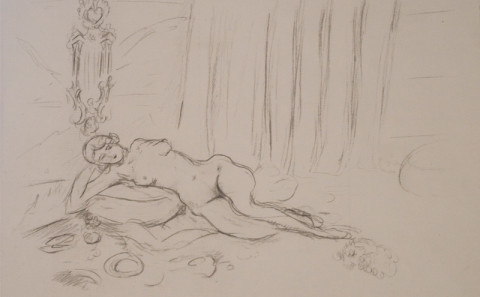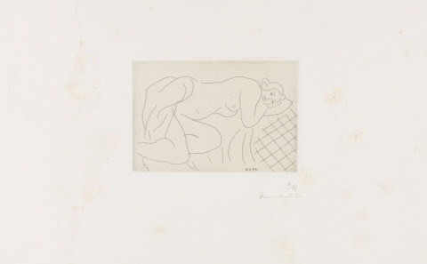 ORIGINAL WORK OF ART by Henri Matisse (French, 1869-1954), Nude Lying on Her Side, Arms Under Head (Nu couché sur le côté, les bras sous la tête), 1929, Etching, plate: 4 x 5 ¾” (10.1 x 14.6 cm); sheet: 11 x 14 15/16 (28 x 37.9 cm), Publisher: unknown, Printer: Vernant or Lacourière, Paris, Edition: 25, The Museum of Modern of Art, New York. Stephen C. Clark Fund, 1951. ©2013 Succession H. Matisse, Paris / Artist Rights Society (ARS), New York.