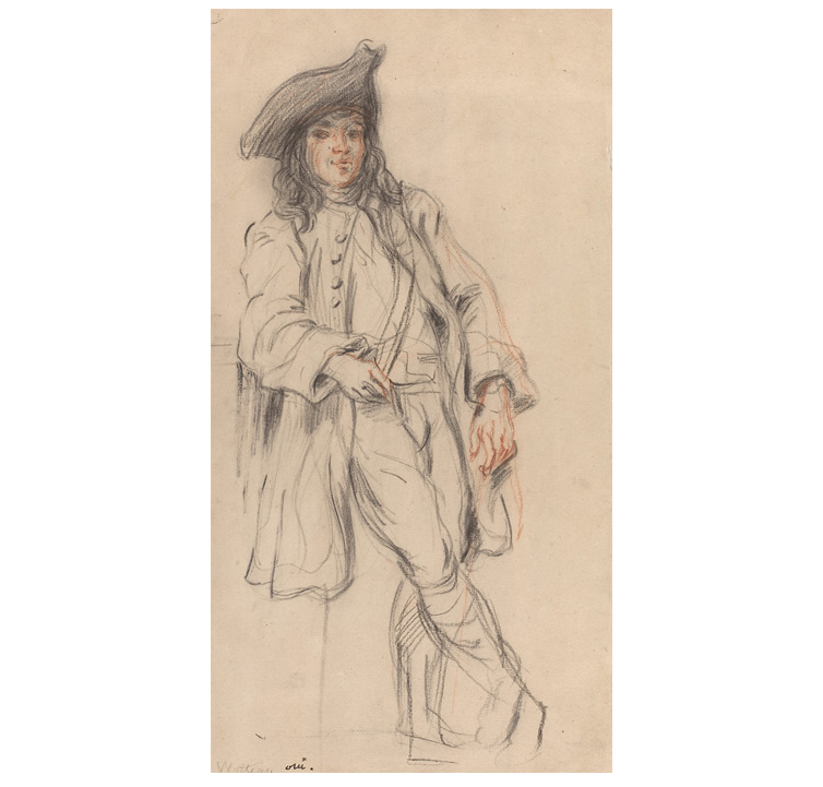 Eric Hebborn (1934-1996), Standing Young Man Leaning on a Plinth, in the style of Jean-Antoine Watteau (French, 1684 -1721), 1970s, black and red chalk on laid paper. Courtesy of the National Gallery of Art, Washington, DC. Gift of Dian Woodner, 2008.38.6.