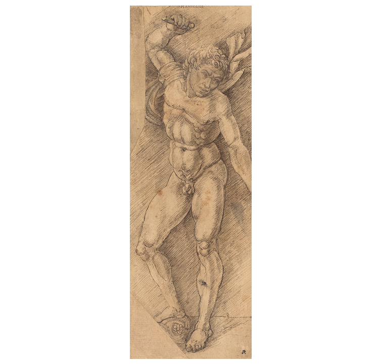 Eric Hebborn (1934-1996), A Naked Man with One Foot on a Helmet, in the style of Andrea Mantegna (Italian, c. 1431 - 1506), undated, pen and black ink on laid paper. Courtesy of the National Gallery of Art, Washington, DC, Joseph F. McCrindle Collection, 2009.