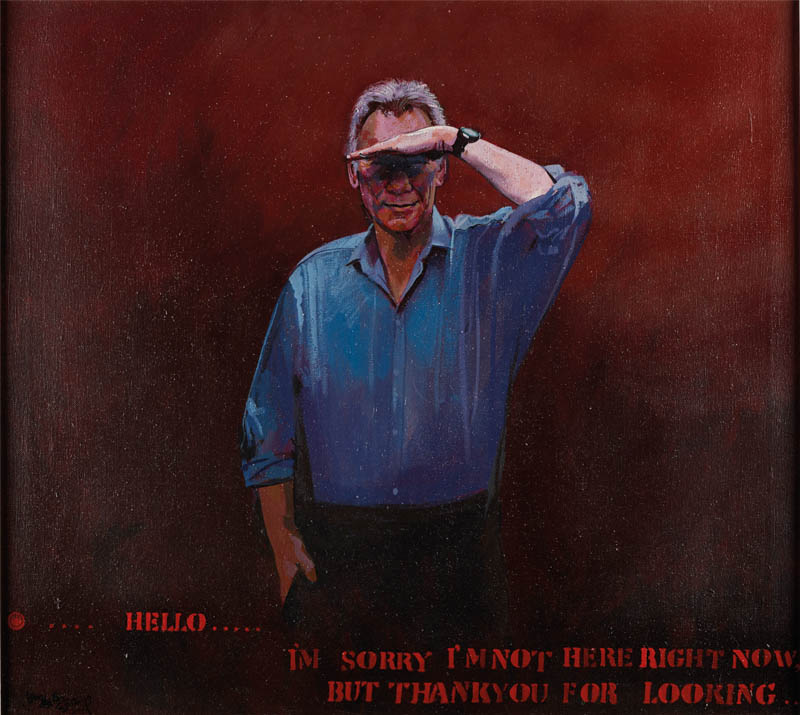 John Myatt (b. 1945), Self Portrait with Shaded Eyes and Text, undated, mixed media on canvas. Courtesy of Linda Ann Foulds. Photo: Washington Green Fine Art.