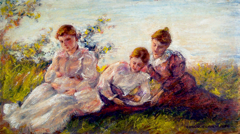 Mark Landis (b. 1955), Women Seated on Lawn, in the style of Charles Courtney Curran (American, 1861-1942), ca. 2000, oil on pressed board. Courtesy of the Paul and Lulu Hilliard University Art Museum.