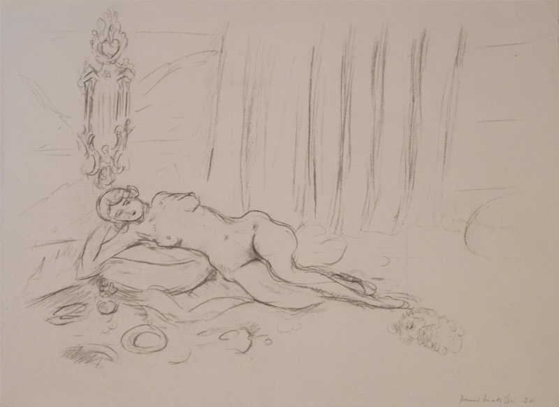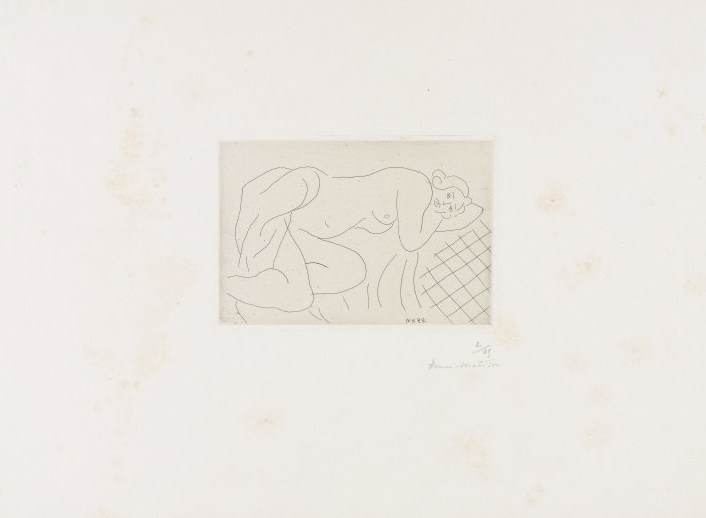 ORIGINAL WORK OF ART by Henri Matisse (French, 1869-1954), Nude Lying on Her Side, Arms Under Head (Nu couché sur le côté, les bras sous la tête), 1929, Etching, plate: 4 x 5 ¾” (10.1 x 14.6 cm); sheet: 11 x 14 15/16 (28 x 37.9 cm), Publisher: unknown, Printer: Vernant or Lacourière, Paris, Edition: 25, The Museum of Modern of Art, New York. Stephen C. Clark Fund, 1951. ©2013 Succession H. Matisse, Paris / Artist Rights Society (ARS), New York.